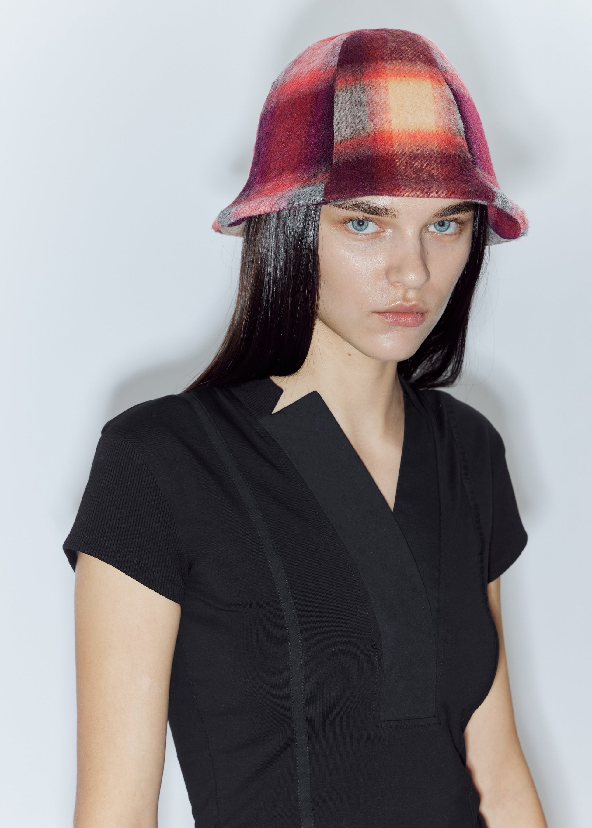 This hat is crafted from plaid wool and is cut for a bell shape.
