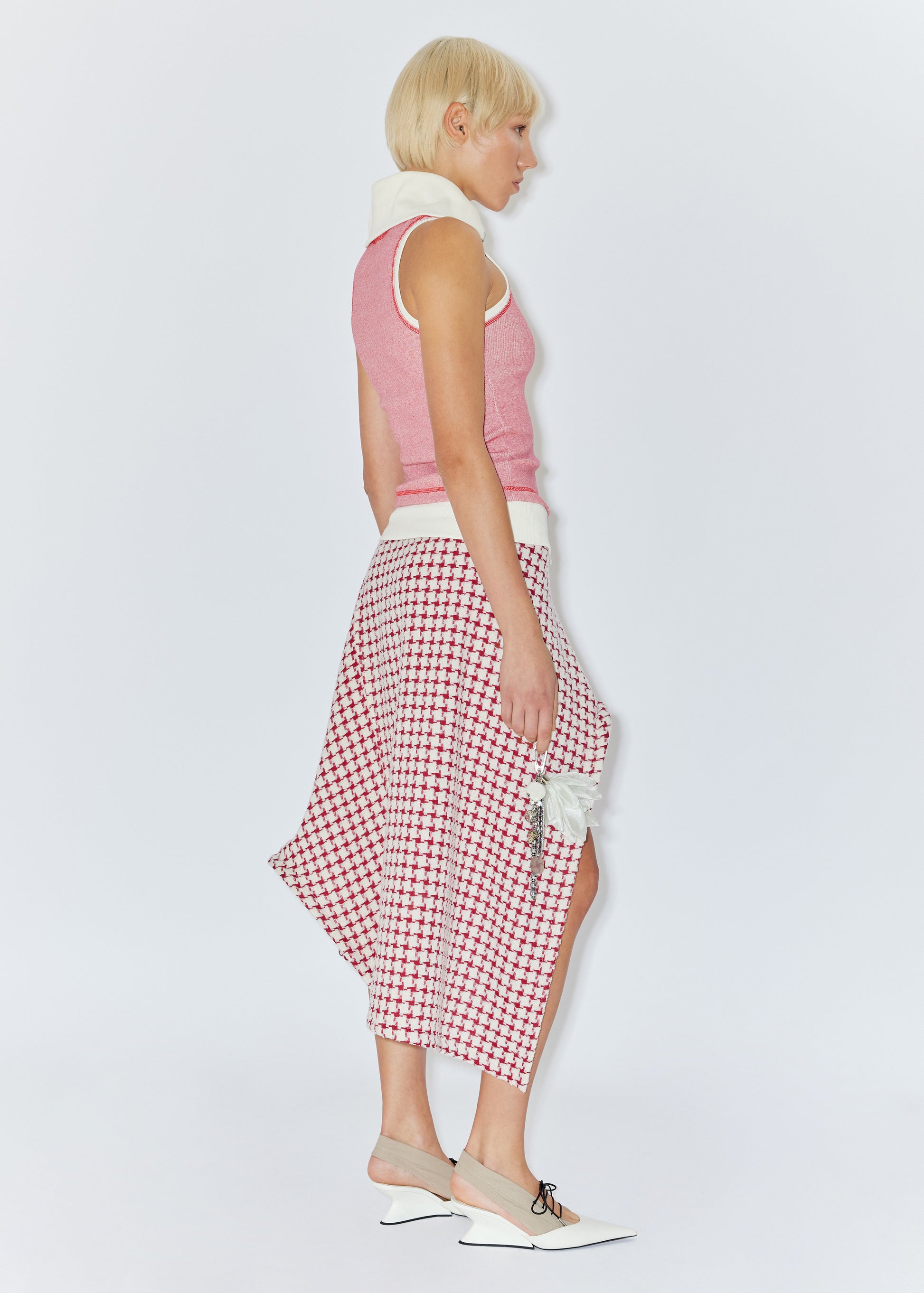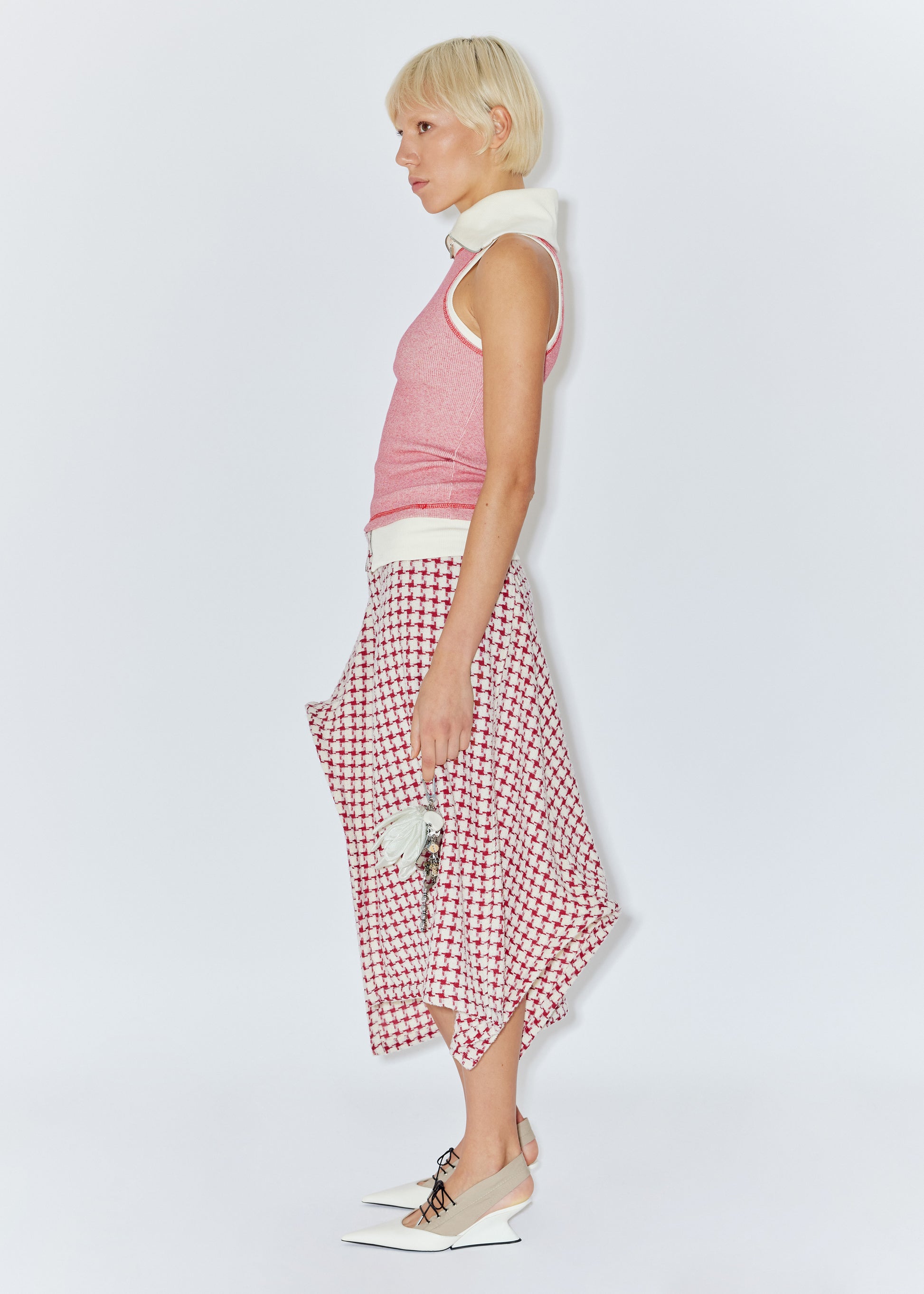 Greta is wearing checkered asymmetric skirt.