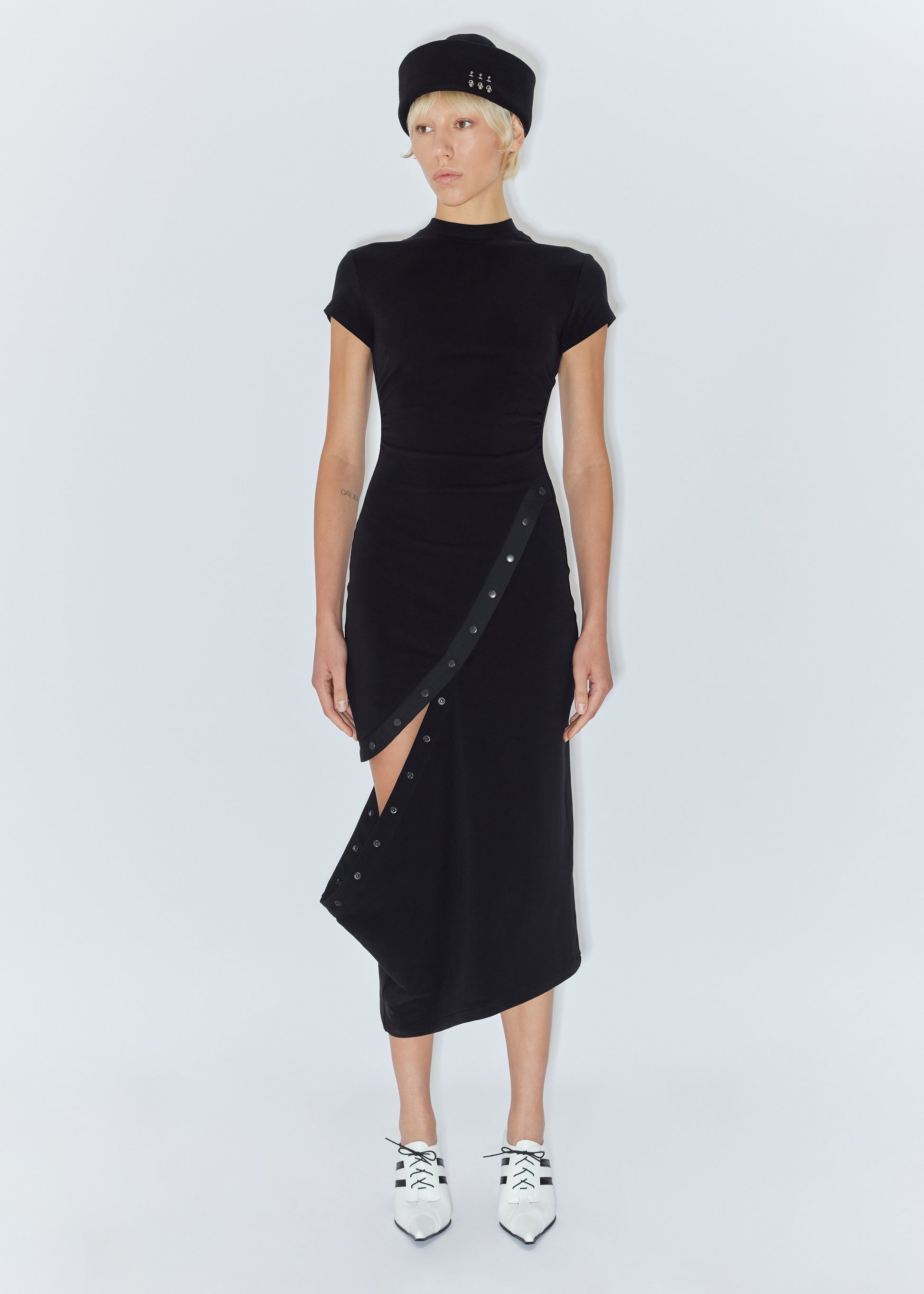 This dress has snap button closure that runs front to back, allowing for a versatile styling. Contrasting tone trim, cut for a fitted silhouette.