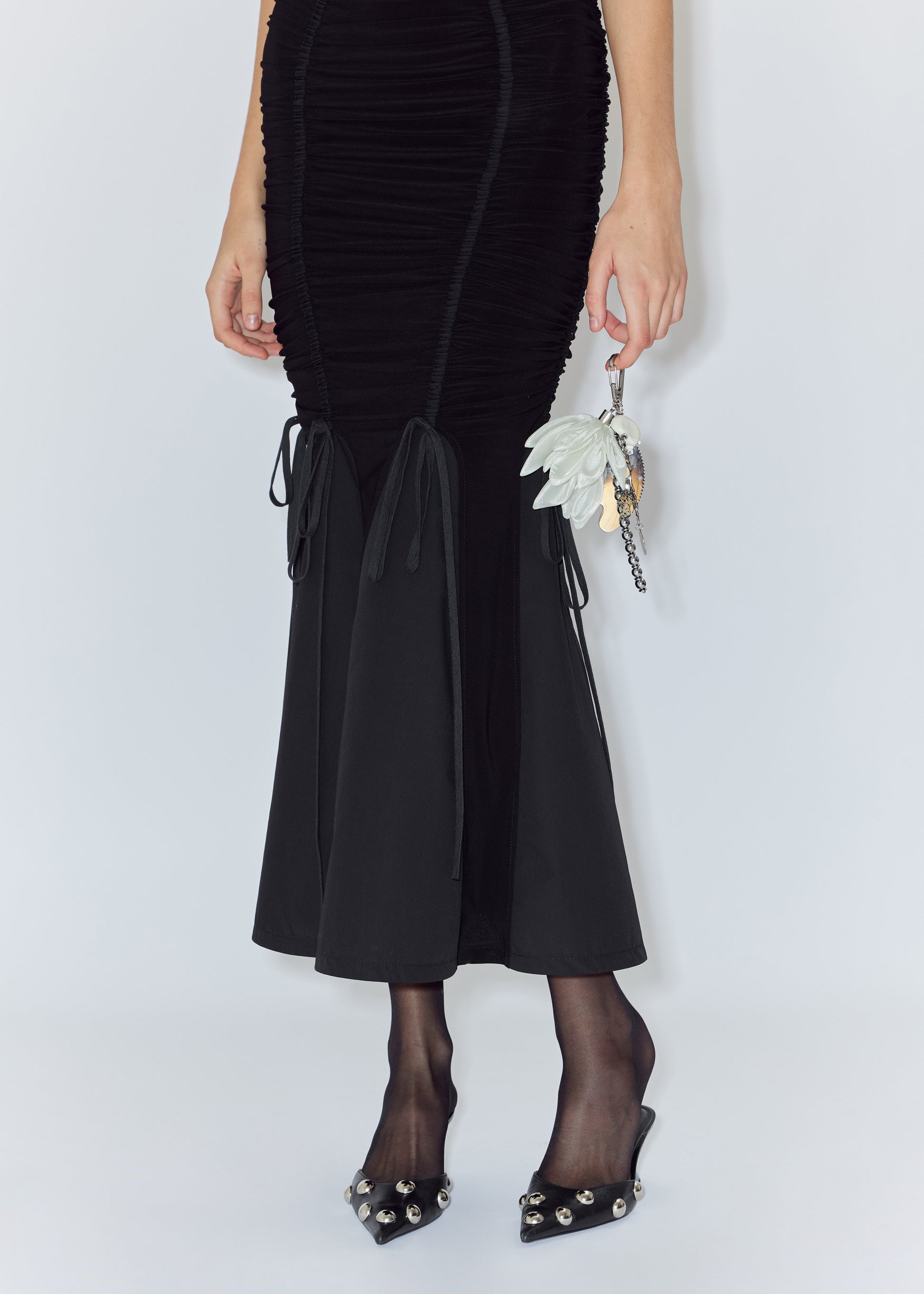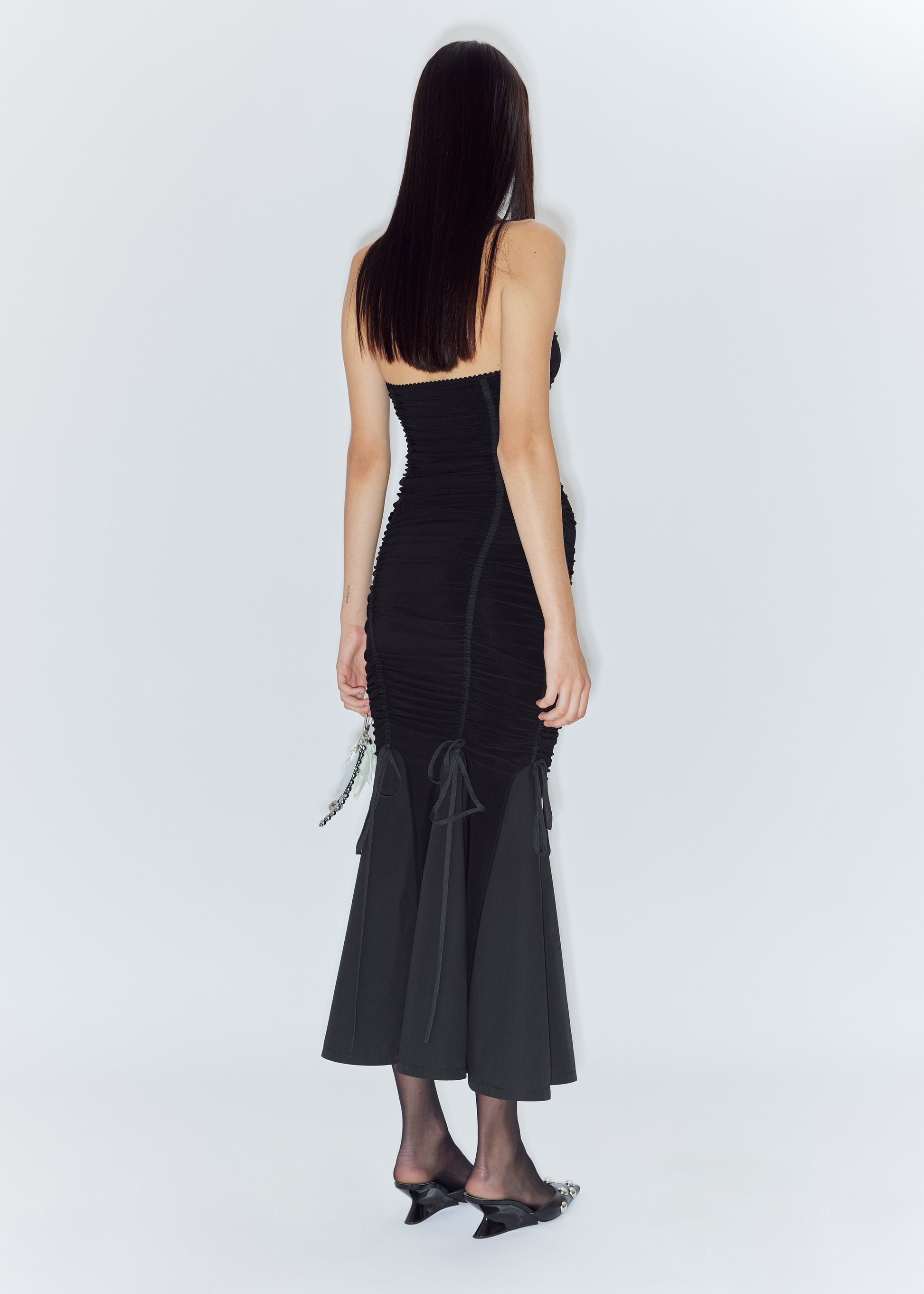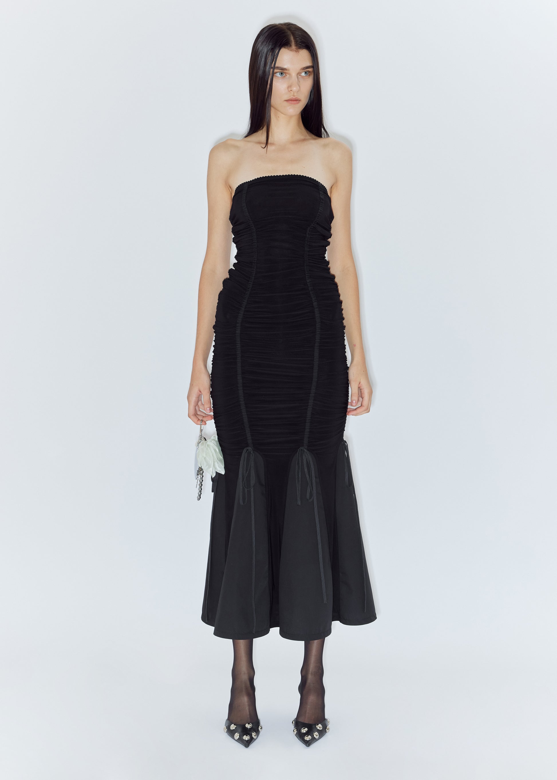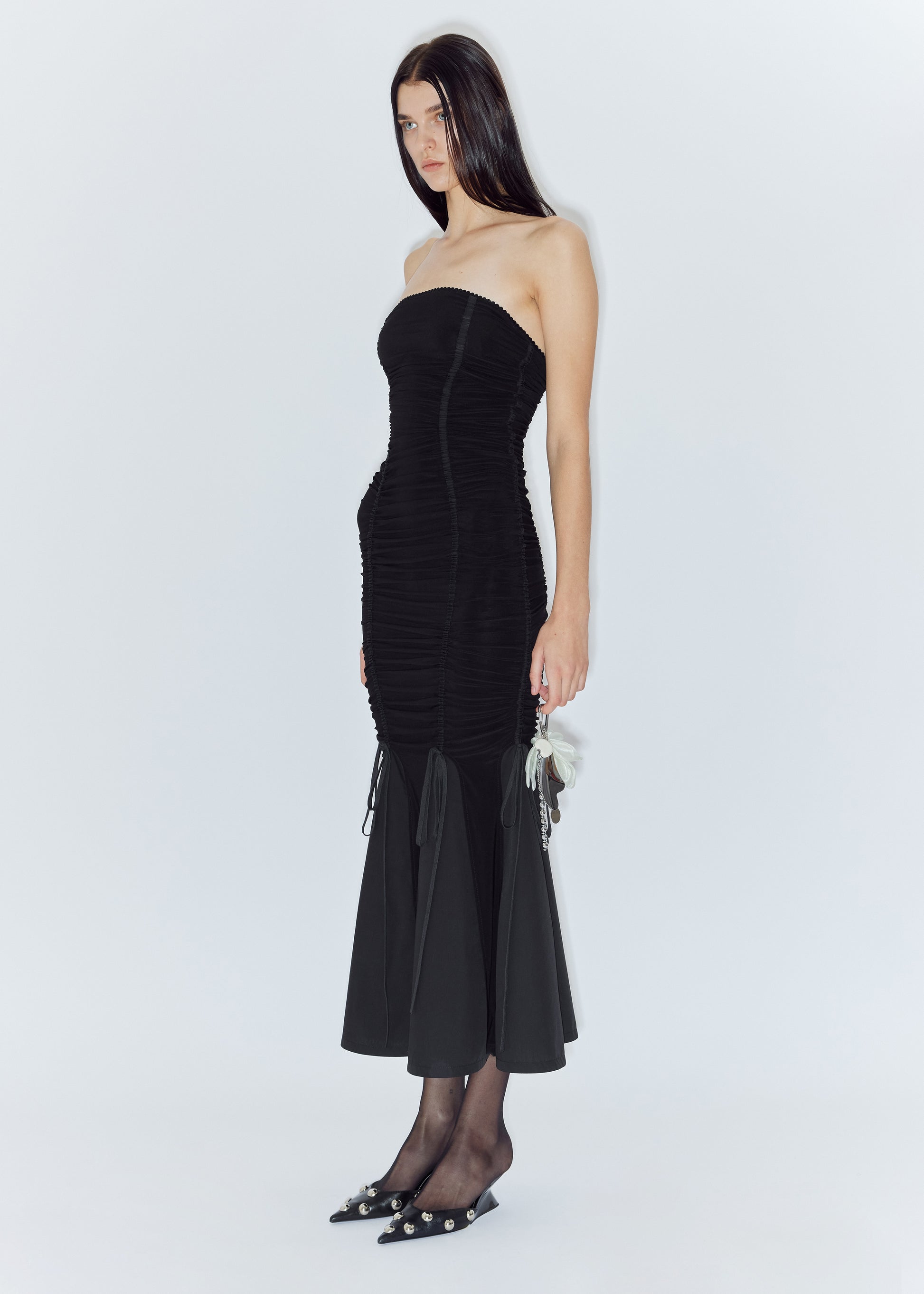Strapless, tight-fitting silhouette. Featuring contrasting tone godet inserts and ruched stripes. Drawstring details for adjustable length.